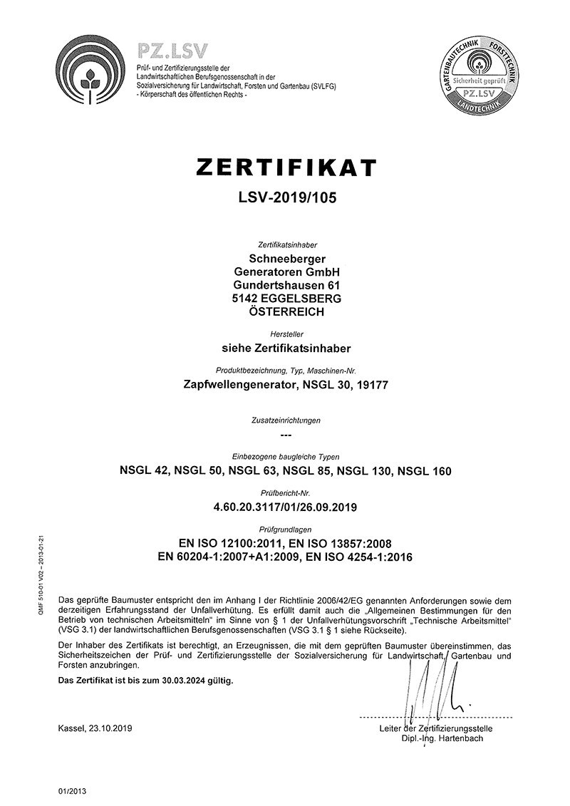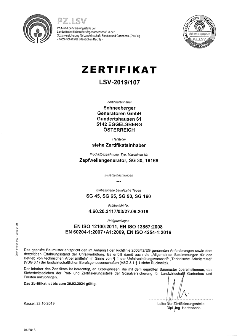 Der Zapfwellengenerator powered by Schneeberger wird von der Sozialversicherung für Landwirtschaft, Forstern und Gartenbau (SVLFG) geprüft und erhält als erstes Gerät seiner Art die notwendige Sicherheitszertifizierung.